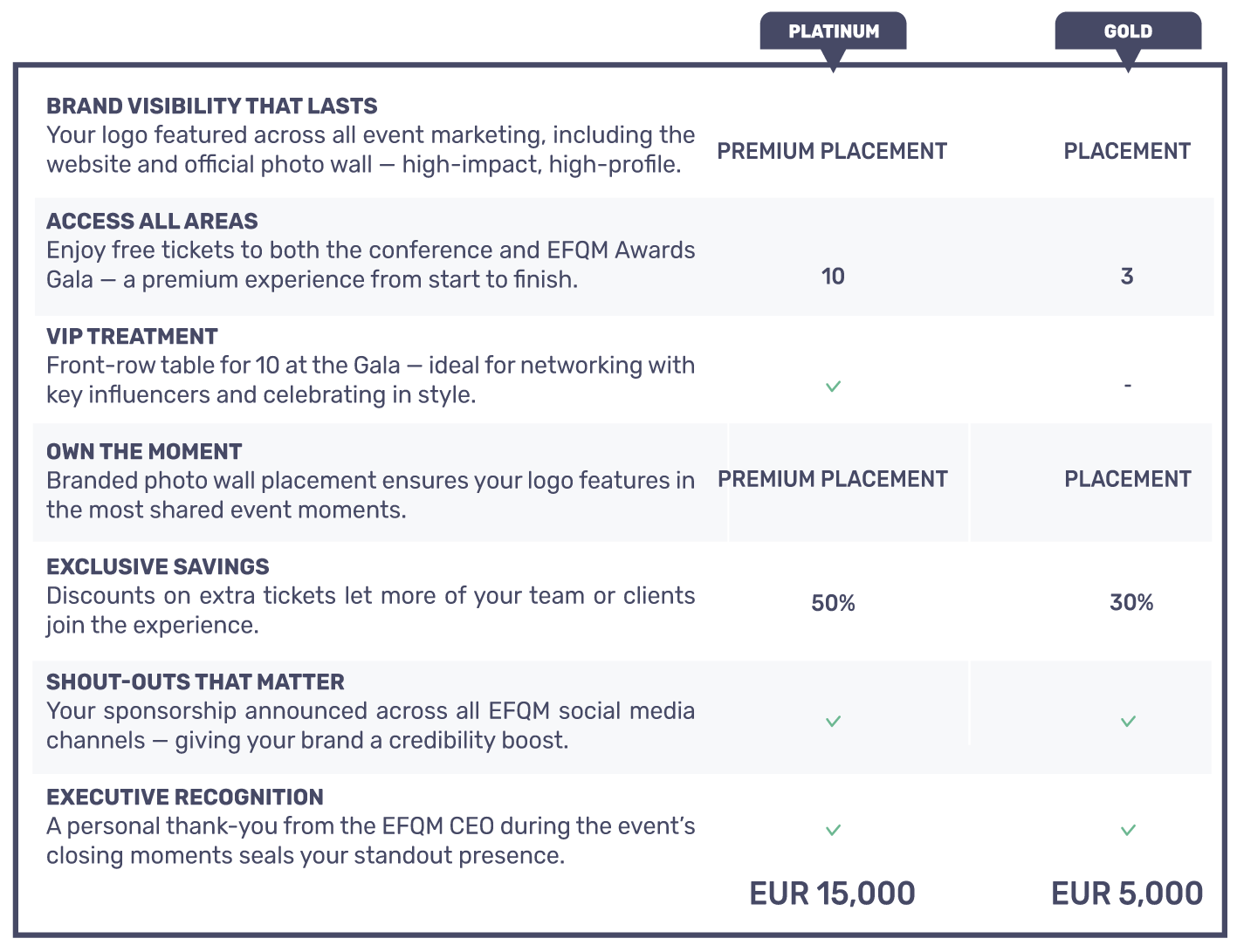 Elevate your brand by partnering with EFQM. Our sponsorship packages offer unique opportunities to showcase your organisation, connect with key audiences, and align with excellence and innovation. Join us to enhance your visibility and make a lasting impact at this prestigious event.